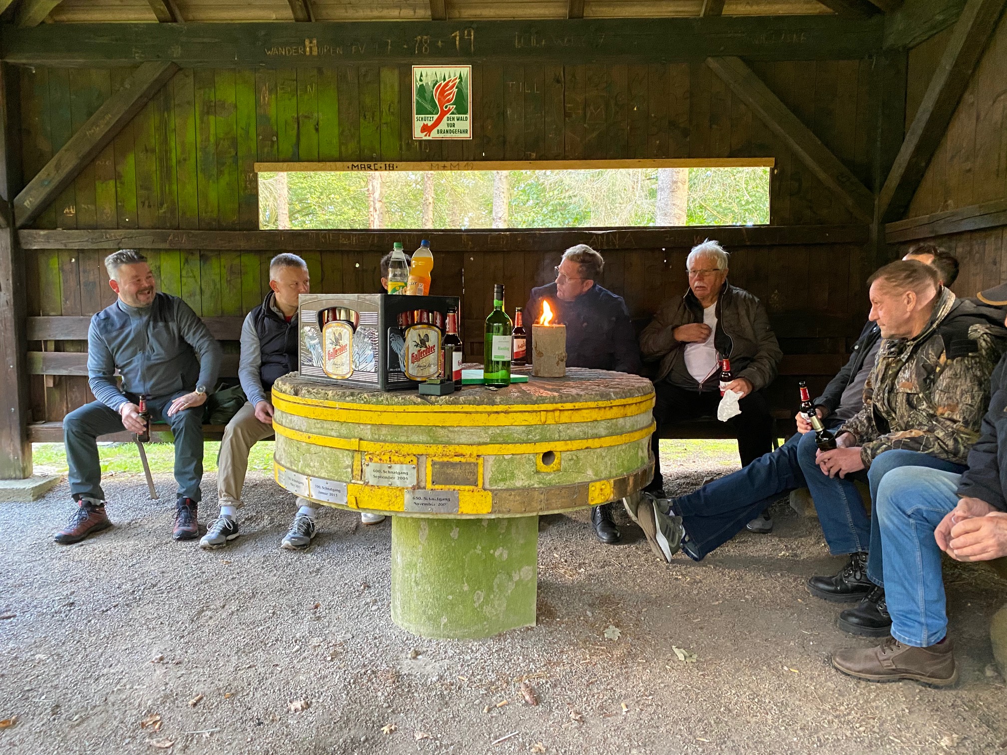 Nach ca. 13 km erreichten wir nach drei kurzen Pausen unser Ziel. Zwischendurch hielten wir unterhalb des Windelsteins. Die hervorragenden Brote geschmiert von Christoph schmeckten uns auf dem Windelstein. Bei Sigfried in der Hütte in Niedermeien gab es eine kurze Stärkung: Kümmerling und Mettenden.